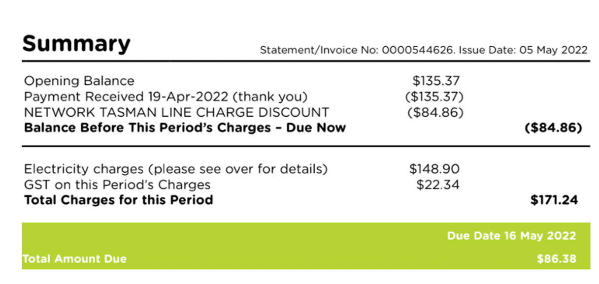 The next discount provided by Network Tasman will be credited on the power bill you receive from your electricity retailer in late April 2025.